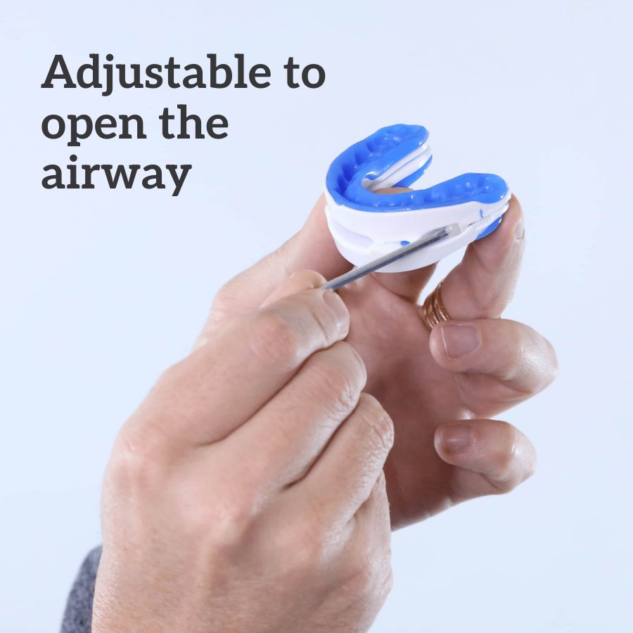 It works by repositioning the lower jaw slightly forward while you sleep to keep the airway open and prevents the soft tissues at the back of the throat from collapsing and obstructing airflow, which is a common cause of snoring.