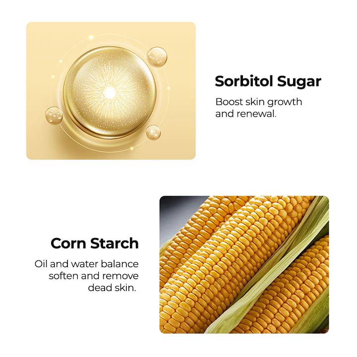 • Sorbitol (sugar) - Buffs away dead skin cells, keratin buildup, dirt, and impurities; accelerates skin metabolism & boosts collagen production to restore elasticity