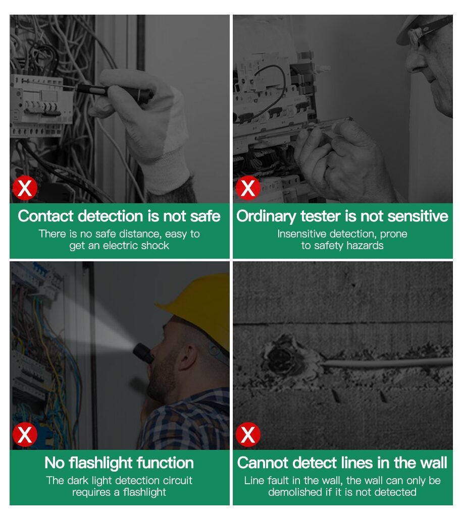 - SAFETY FIRST: It will send out multiple alarms through sound and light. When the voltage is detected, the tip will send out red light and beep. When the higher the sensed voltage is, or the closer it is to the voltage source, it beeps at a higher frequency. At the same time, the screen will be red or green, red means high voltage and live wire are detected, green means low voltage and null wire are detected.